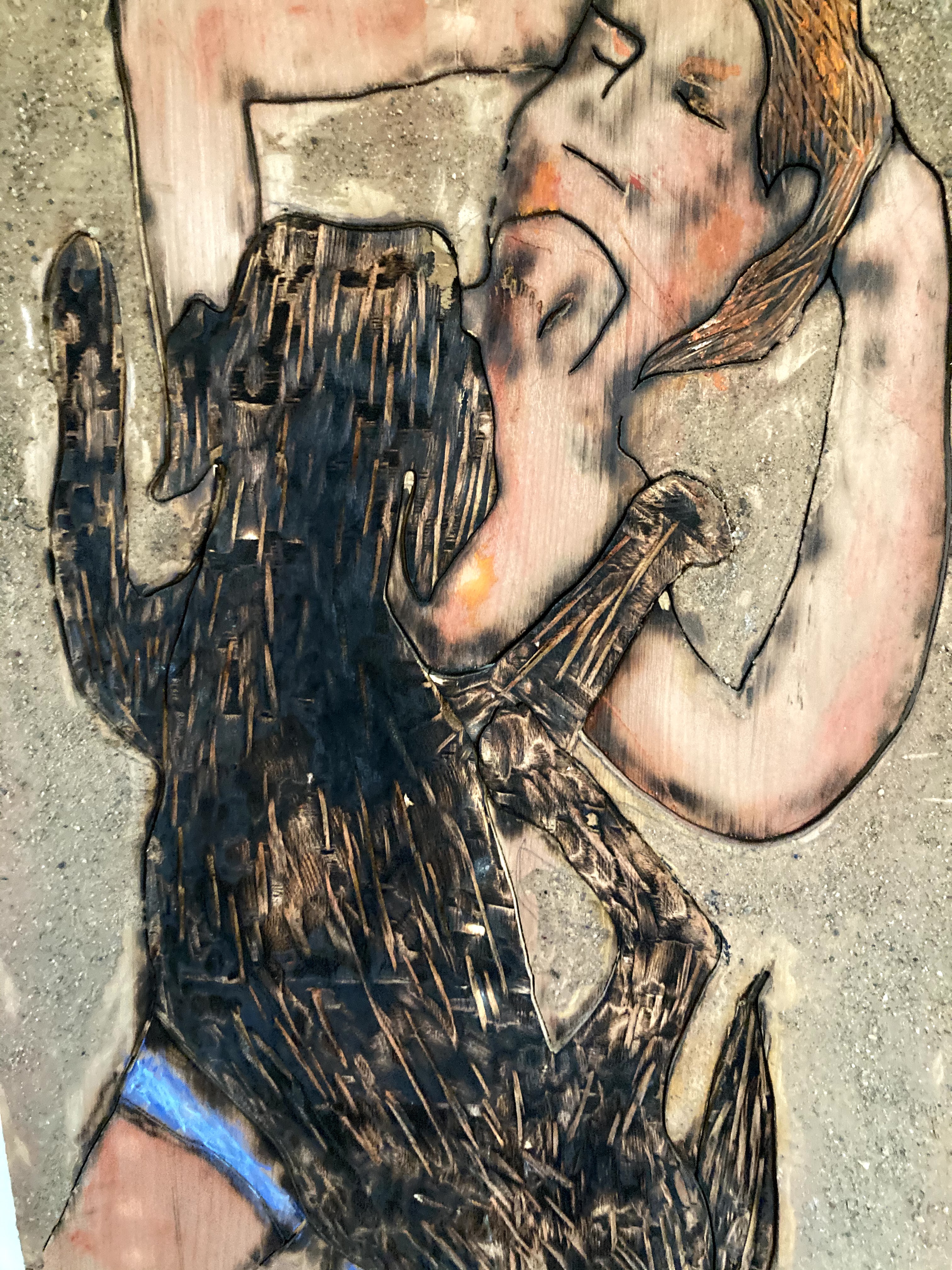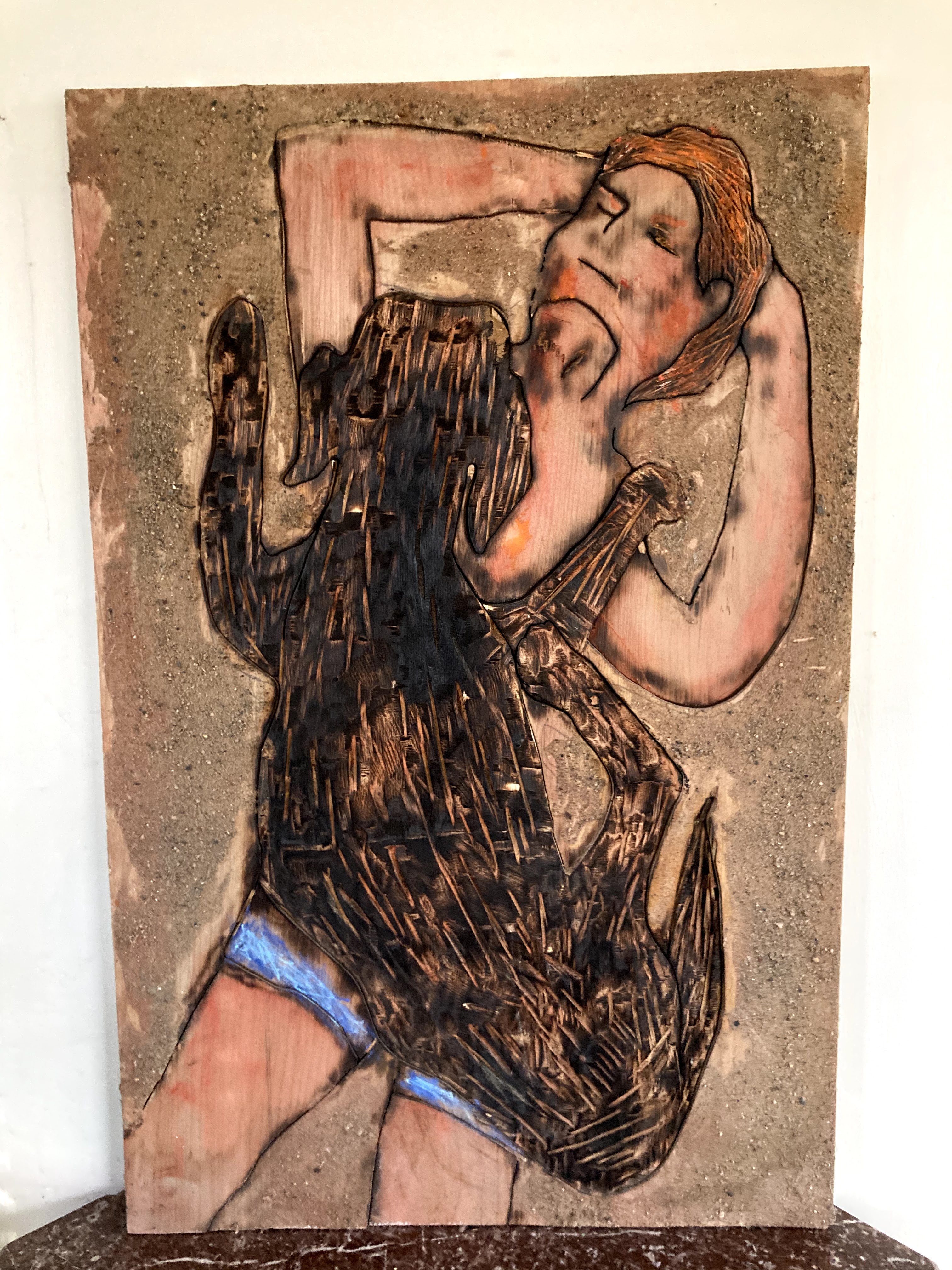 Oil, pastel, sand on burnt, carved wood. 24×37.