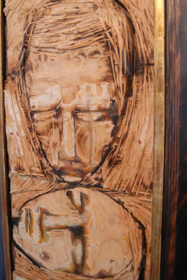Kissing Father Goodbye Oil on burnt, carved wood, 18×30 in. Private collection. Share this: Click to share on X (Opens in new window) X Click to share on Facebook (Opens in new window) Facebook Like Loading...